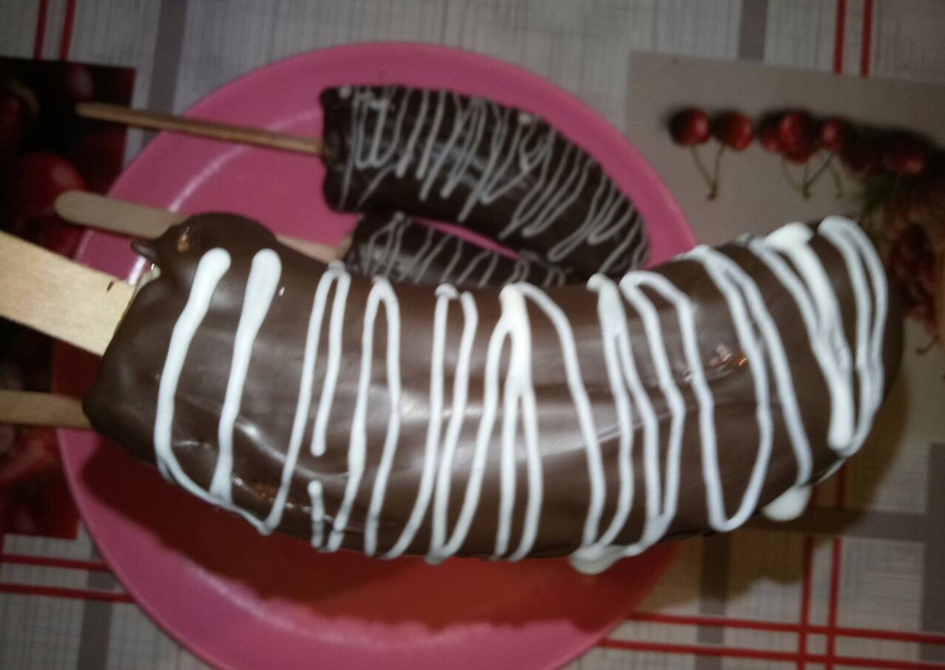 - Divisez la banane en deux, plongez dans le chocolat et remuez jusqu'à ce qu'il refroidisse, puis décorez le chocolat blanc comme sur la photo.